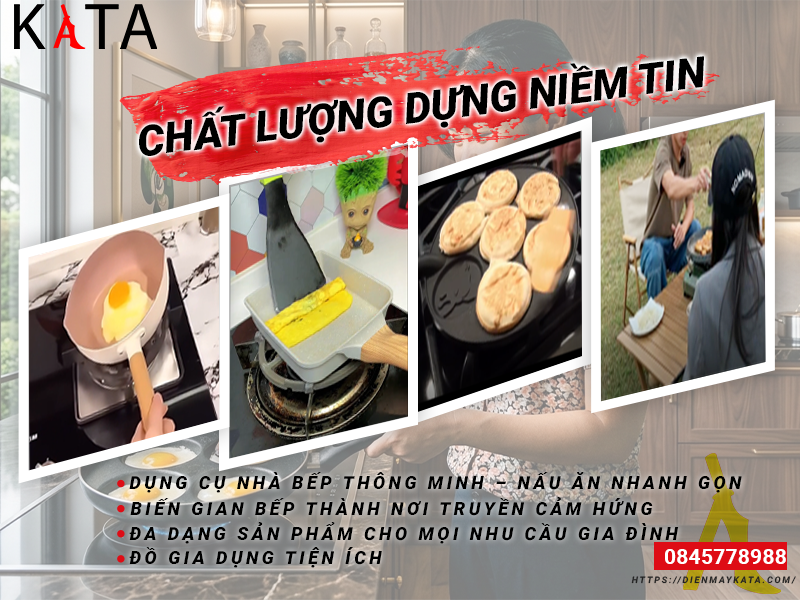 Bên cạnh các giải pháp điện máy, KATA còn mang đến đa dạng sản phẩm đồ gia dụng phục vụ nhu cầu nấu nướng và sinh hoạt hằng ngày của mỗi gia đình. Với các dòng chảo, nồi và dụng cụ nhà bếp được lựa chọn kỹ lưỡng về chất liệu và độ bền, chúng tôi mong muốn mang lại sự tiện lợi, an toàn và trải nghiệm nấu ăn thoải mái hơn cho người sử dụng.